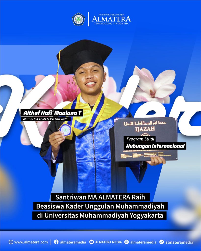 Yogyakarta, 26 Juli 2025 — Satu lagi torehan prestasi membanggakan dari MA ALMATERA. Alumni bernama Althaf Nafi’ Maula Tsaqif berhasil meraih Beasiswa Kader Unggulan Muhammadiyah (KAUM) untuk Tahun Akademik 2025/2026, jurusan Hubungan Internasional di Universitas Muhammadiyah Yogyakarta (UMY)